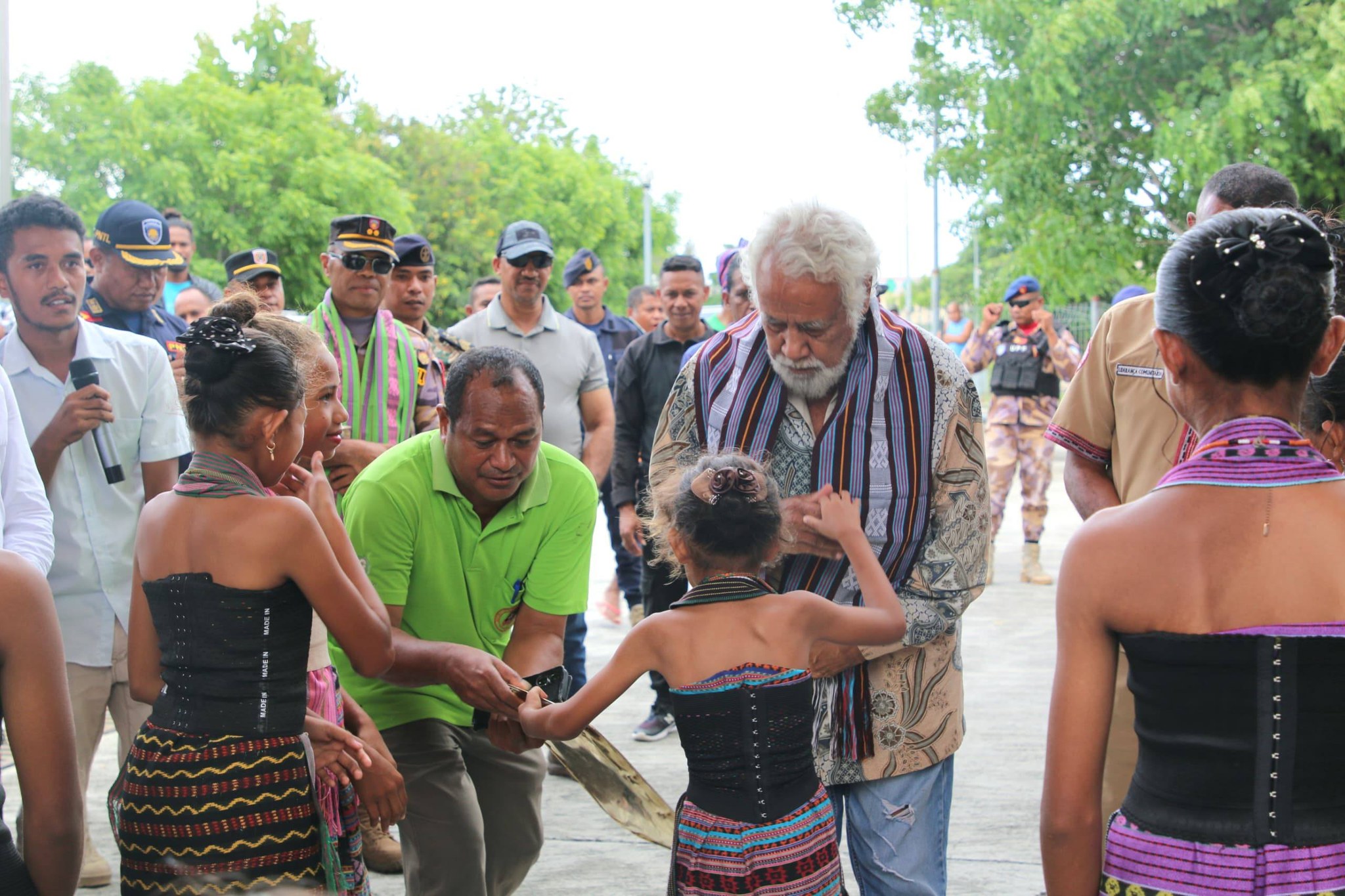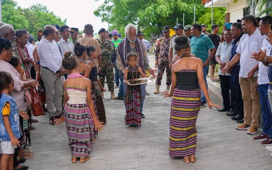 Autoridade RAEOA hamutuk ho populasaun lokal simu S.E. Primeiru-Ministru iha fronteira Sakato, Suku Nipani, Sub-Rejiaun Pante Makasar, ho dadolin tradisionál Atoni nian “Takanab” no tebetetebe hanesan forma bem-vindo.
