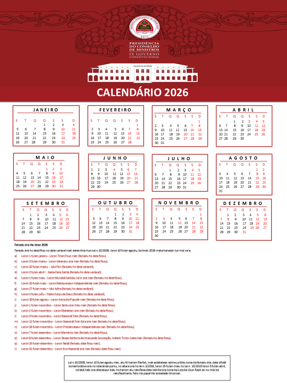 Feriados 2026 Presidência do Conselho de Ministros Porta-Voz do Governo de Timor-Leste IX Governo Constitucional